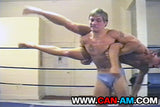 This was Buddy's first match with BG - a barefoot Speedo confrontation with cute Danny Brown. It soon became clear to BG that Buddy Justice's skills far exceeded Brown's. And even though there is pretty good give and take in the first fall it is Buddy who comes out on top. Give Danny credit though, he comes on more forcefully in the second fall, at one point tying Buddy up in the ring ropes and choking the blond wrestler. After being softened up, Buddy eventually falls victim to Danny's camel clutch. Buddy is pissed. In the 3rd fall he launches an all-out assault. Brown is viciously body slammed, unmercifully slugged, thrown out of the ring, head bashed on the mat. Danny recovers somewhat but from there it is Justice all the way to the very end of the match.