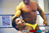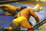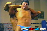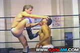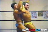 (A Gold's Gym Bodybuilder Bout) Even before the bell rings the two are battling it out in ring center with a muscle posedown. With the posing done, the wrestling starts. As usual the Psychopath seems obsessed with the camera and the audience. He drags poor Atlas around the ring and keeps shoving his head towards the camera asking him to smile. The Psychopath loves to lift and squeeze and poor George Atlas has to endure. The two split the first two falls, with Atlas taking the second with a wonderful headscissors. The third fall ensues and the loser gets stripped. The loser runs from the ring, eager to get out of camera range, humiliated at being shorn of his wrestling gear.