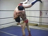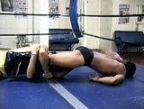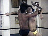 This pro wrestling match goes a full two out of three falls. The wrestling adversaries go all out to win this match. In the second fall, with La Pantera leading 1-0, Tony Blanco resorts to ball-bashing which leads to a victory. La Pantera does not forgive this shortcut to winning as you will see when he has Blanco across his shoulders with a final fall victory. He grabs Tony’s substantial cock and gives it a big squeeze. Check out the closeup! Throughtout this pro wrestling bout there are lots of underhanded maneuvers as well as high flying action. These guys are not easy on each other.