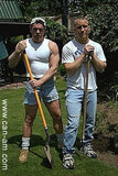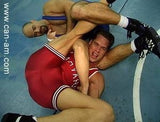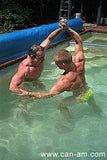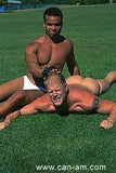 Besides being one of the world's hottest men, Can-Am Vancouver manager Mark Wolff is producing totally unique and enormously popular wrestling videos. CANADIAN BUILT WRESTLING CLUB 2 gave you four matches. CANADIAN BUILT WRESTLING CLUB 3 gives you six matches in natural and domestic settings. And yes, Mark Wolff is in one of them. MATCH ONE: Shawn Simpson VS Ivan Bure. Shawn and Ivan strip wrestle each other out of street clothes down to their undershorts in an apartment living room. MATCH TWO: Marco D'salvo VS Blake Stone. Athletes Blake and Marco wrestle outdoors on a playing field stripping down from shorts and tank tops. These two muscular jocks use the whole field to rip-strip each other to their tight white briefs. MATCH THREE: Tony Preacher VS Jacques LaPlant. Street clothes get ripped off as Tony and Jacques square off in a bedroom. A belt gets used for unfair advantage as these two hotbodies wrestle-strip each other down to white shorts. MATCH FOUR: Mark Wolff VS Nicholas Bodiev. In a gymnasium Mark exercises wearing a skin tight red singlet. Matched against Mark is gold medal winning international free style wrestler Nicholas Bodiev wearing a blue singlet. Mark gets ground into the mat losing fall one. He rallies to best Bodiev in fall 2; but loses the match and his singlet to competition experience. Ahh.... Mark Wolff naked at last! MATCH FIVE: From previous matches Ivan Bure and Tony Preacher are first time paired in an indoor match wrestle stripping each other out of street clothes down to muscles and shorts. MATCH SIX: Jeff Renshaw VS Brad Sargeant. Buff bodybuilders Jeff and Brad start off gardening, then lawn wrestling, and finally battling it out in the shallow end of a swimming pool wearing a jock and a bikini. CANADIAN BUILT WRESTLING CLUB 3 delivers endless wrestling action for $49 bucks in unique nontraditional settings for a hot, sexy, fresh approach to wrestling fantasy. A whole lotta action for $49 bucks! Note: Several of the images used on this page are poor quality because they had to be captured from the video. Unfortunately the negs were lost in transit by the courier. The quality of the video is first rate.