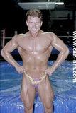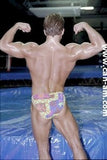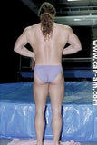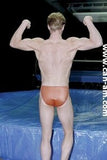 BOUT #4: JOHNNY LIGHTNING VS. JIMMY ROYCE: Lightning: 5`10", 190#, 22. Royce: 5`10`, 180#, 22. Johnny wrestles in a brief print bikini, and Jimmy in his usual "into the butt" slippery blue briefs. Surprisingly, except for a few brief moments, its Johnny Lightning who is mostly in control in the first fall. And it`s Jimmy Royce who yells out his pained submission when Johnny applies a figure four leglock. But we have come to acknowledge over the months the status of Jimmy Royce as a beautiful sufferer - both to hear and to see. And who better than to inflict the suffering that Johnny Lightning. Guess what happens in the last fall. Bedtime for Jimmy! It`s a very hot sequence that has the muscular Jimmy slowly going down, ever so slowly. His well muscled body becomes totally useless as he sinks to the mat in total darkness. Johnny slaps him until he wakes up after having given us a victory pose. Johnny Lightning`s winning streak continues.