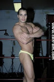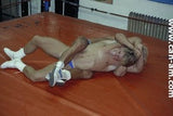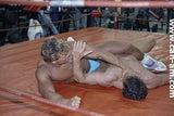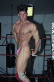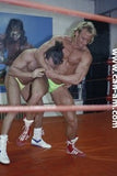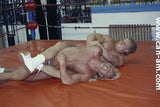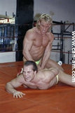 Bout #3: flex vs. Lionheart. Flex: 5'11", 203#, 28 yo. Lionheart: 6'0", 200#, 30 yo. Flex has a bodyfat quotient of virtually zero. There is as much muscle definition on this hot looking grappler as could possibly be slabbed on to any human being. In the first fall there is some hot ring rope action, for example when Lionheart throws Flex into the ropes expecting to clothesline him only to be on the receiving end of one himself, or when Flex comes off the ropes and jumps on top of Lionheart sending him to the mat, or when Lionheart comes off the ropes and almost ends up decapitated by the ring ropes on his throat. The first fall mostly features Lionheart trapped in holds in which Flex delights in posing for the camera. Flex shows us why his name is so apt. Flex is lifted off the mat and is squeezed. Seeing Flex's very muscular body up in the air, flailing about, being squeezed by a pair of muscular arms, Lionheart's crotch to Flex's ass, is an anatomy chart in motion. The bearhug shifts crotch to crotch, chest to chest. The visuals get even better. Flex is hurting, he's corner bombed, he's choked, he's bear hugged again and again.