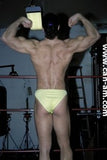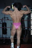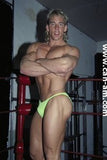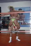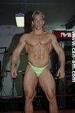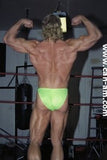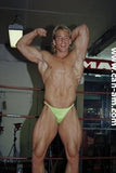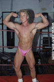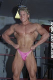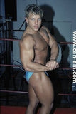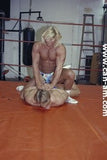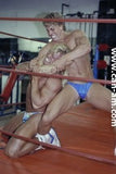 Bout #4: james blond vs. Johnny lightning. Blond: 6', 205#, 23 yo. Lightning: 5'10",190#, 21 yo. James Blond looks like the ultimate, handsome, muscular, heart-throbbing California beach boy. That long blond hair you see is natural, bleached out by the sun. James appears in ring center in tight bike pants and does a brief warmup. No, he doesn't wrestle in them. Instead he turns around and takes them off, stripping down to a pair of flowery briefs. A killer tan, dark glasses, and white boots complete the look. Johnny Lightning jumps into the ring in his purple t-back and white boots and lays into James Blond with some forearms to the chest. James thinks he has been hit by a gnat, laughs, and says, "is that all you got?" Johnny responds with a direct hit flying drop kick that totally lays Blond out on the mat. Blond is bashed and trashed after this, but make no mistake this big blond musclehunk is no pushover. Johnny has to work for it. You'll certainly see Johnny's villainy skills sharpened in this matchup.