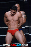 Vineland tosses DiMaggio agains the ropes, cornering him and taking the first coveted opportunity to attack his junk, after first stroking his abs. Soon DiMaggio is suffering in a standing half nelson, which displays the full glory of his deep, sensual armpits and stretches those external obliques.