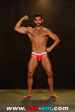 This is lucky number 7 appearance on the Can-Am mats for Latin heartthrob Nathan Cortijo. In his previous matches he has usually ended up suffering mightily, but he suffers so beautifully, Boss Sexton always brings him back. This time he will have a height advantage over brawny fireplug Matt Miller, but will it be enough? Miller is the ultimate little muscle boy, sporting a big meaty ass and pushing a big meaty crotch as he does his opening stretches in the Can-Am gym. You’ll be dreaming and creaming wishing his tree trunk thighs were planted on you, the tight fabric of his blue speedo just inches from your nose and lips. Take a deep breath of that manliness, before your eyes pop over to the tight, long frame of Cortijo. Cortijo is not happy that Miller in his space, and the two are soon locked in a battle for marked territory. We’re pretty sure that Cortijo won the “Varsity†tag on his too-small red briefs for the prize hanging between his thighs. If you can manage to tear your eyes away from that impossibly full bulge, you’re a better man than us.But Miller has only one thing on his mind – domination. He wraps Cortijo’s neck up in a crushing bicep chin lock. But the pain has only started. Miller gets Cortijo’s hands locked behind his head, his tempting pits fully exposed (with Miller seeming to enjoy the scent), while wrapping his other paw around the bulging red crotch. It’s definitely Miller time in the Can-Am gym.