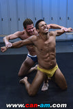 Santiago Santos vs. Ken RodgersIt’s a barefoot battle between two tenacious muscle pups. Santiago Santos is looking more cut than ever, stretching it out on the black mats. His arms are bigger. His toned body more defined, as his olive complexion reflects the warm lighting of the locker room. As his opponent-to-be approaches, Santos gives his yellow speedos a flick, lowering them just enough to expose his breathtaking inguinal creases, so smooth and deep one can’t help fantasizing about running one's tongue up and down them. But lean and tall Ken Rodgers has other plans today. You see, both muscle pups were told to report here by the coach for the purpose of choosing a team captain. But coach is nowhere to be seen. Was this the plan...to make them fight for it? Hehe, if so, let’s go!