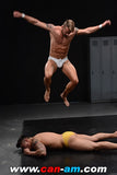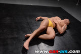 Cute fireplug Scotty Marx looks like he just woke up from a nap, ready to stretch his thick muscles. Jobe Zander menaces the smiling fireplug, admiring his powerful build. Knees and fists drive Marx to the mat, his cute smile fading fast as Zander brutalizes him. Yes, Marx is strong...but Zander is mean...crushing the kid between his thighs and practically ripping of his yellow-clad balls.Zander seems to grow more powerful with every squeeze, strike, and stare, rollicking with erotic eagerness the more Marx moans and writhes. Watch the master heel grind the fireplug jobber into dust.