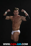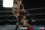 Soon Zander is sweating down his chest, his golden body glossy with the efforts of his punishing holds. Davenport repays the favors with torturous ball abuse and an ass-to-ass reverse camel where he literally rides Zander while pulsing up and down and clutching his package cruelly. Zander recovers, intwining poor Davenport in the corner ropes and attacking his abs and package, until Davenport collapses to the floor like a marionette with the strings cut.