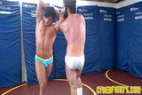 Hairy, toned sexgod Zack Reno looks incredible doing pull-ups in revealing white trunks and boots. His beard and unruly hair give him a wildman edge that cute Cam Zagucci can't match. But he can match Reno's workout. Monkey-like, cutie Cam swings from the ceiling beams in his mint green and yellow trunks, disrupting Zack's workout by creeping up behind him and smacking him from behind with his feet. Booted Zack and barefoot Cam faceoff in a workout challenge with pushups, but Cam can't resist the urge to climb aboard Zack's sexy back and camel the hell outta that hairy hunk.The boyish battler presses his soft, pink foot into Zack's back, then hoists him up and plows him into the wall. A hot headlock results in Cam getting a taste of his own medicine, as his arms are wrenched upward, exposing his tender armpits. Lean, hairy Zack enjoys some sexy back and forth with the kid, as they roll and rage at each other in brotherly combat.