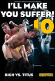 “Wanna play?” the crazed creature asks. Yeah, Titus wants to play…boot to the jaw! Heel to the chest. Now the collective viewers are pumping their fuckrods with vigor as these two brutes go at it for keeps. Rich responds with a poorly placed fist to the groin that inspires Titus to shove him into a corner and pull his hair, then pull him into a full carry with Rich’s arms and legs wrapped tightly around the lone wolf like a koala around a tree trunk. Rich throws his head back and laughs, a creature of darkness getting his fondest desire.