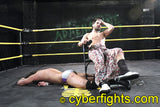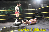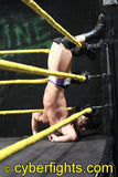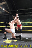 In an incredible act of strength, Jacobs hoists Blackwell up off the floor and suspends him upside-down from the yellow ropes, putting him perfectly in place for abdominal, face, and arm punishment...later enveloping him in a full body scissor, forearm crushing his neck, fingers entwined in his hair...all the while the trash talk never stops.