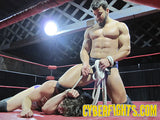 All too soon the gladiator is being dragged around the ring like a baby calf. It’s a bit like going down on the farm and watching a pair of shiny cowboys settling a disagreement in a barn with ass-humping skill and determination. The sight of a mammoth man like Maverick being bested is a site rarely seen. Blackwell takes advantage of Maverick’s inability to move by throwing his own muscular frame on top of him in a humiliating position that can only get your own personal fuckcannon revved up that much more!